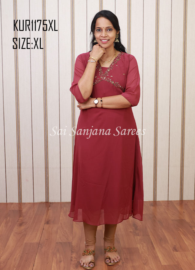Georgette V neck Hand Aari Work Kurti Size(XL)