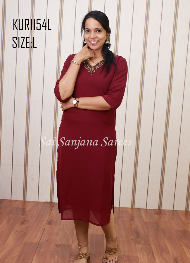 Georgette V neck Hand Aari Work Kurti Size(L)